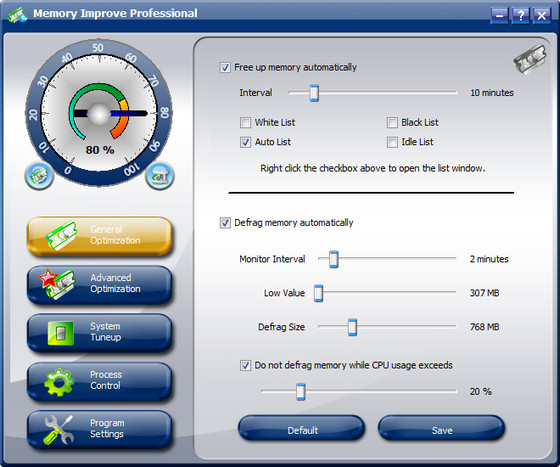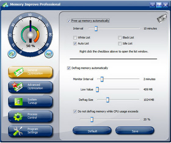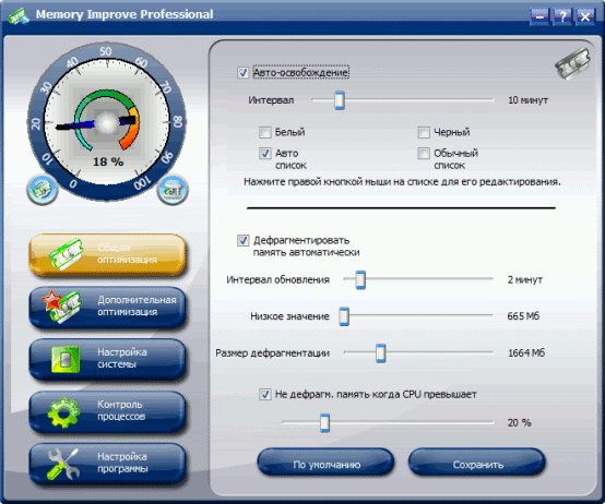 Memory Improve Professional позволяет увеличить быстродействие вашей системы за счет освобождения и дефрагментации оперативной памяти. Имеется возможность установки минимального количество свободной оперативной памяти, при превышении которого запустится модуль и попытается удалить из оперативной памяти лишние процессы, имеется возможность возможность просмотра запущенных процессов, наблюдение за нагрузкой на ЦП и множество других полезных настроек.