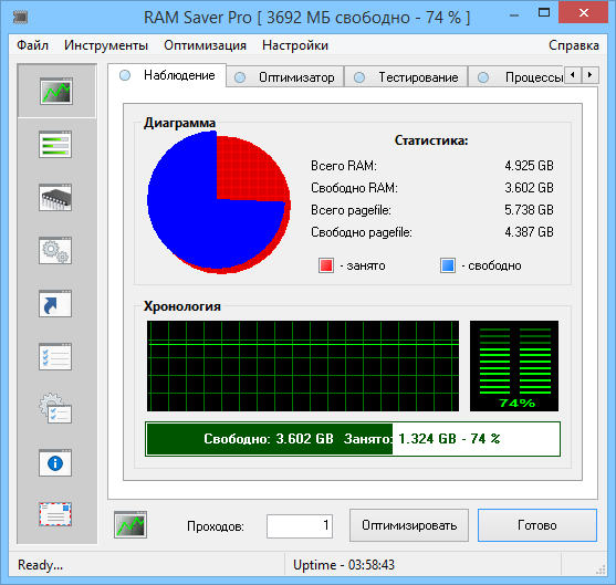 RAM Saver Pro - инструмент для профессионального мониторинга, очистки и оптимизации оперативной памяти. Скачав его на cwer.ws, вы сможете увеличить производительность операционной системы, освободив оперативную память от драйверов и процессов Windows для приложений, нуждающихся в максимальной загрузке процессора и оперативной памяти. RAM Saver Pro дефрагментирует системную память для быстрого доступа к ней, улучшает эффективность работы процессора и кэша памяти, восстанавливает утечку памяти в плохо оптимизированных приложениях, временно помещает не используемые библиотеки и драйверы в swap-файл, освобождая RAM.