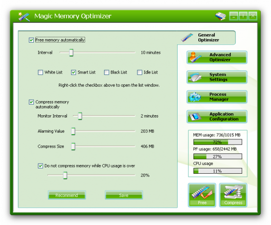 RAM Saver Pro - инструмент для профессионального мониторинга, очистки и оптимизации оперативной памяти. Скачав его на cwer.ws, вы сможете увеличить производительность операционной системы, освободив оперативную память от драйверов и процессов Windows для приложений, нуждающихся в максимальной загрузке процессора и оперативной памяти. RAM Saver Pro дефрагментирует системную память для быстрого доступа к ней, улучшает эффективность работы процессора и кэша памяти, восстанавливает утечку памяти в плохо оптимизированных приложениях, временно помещает не используемые библиотеки и драйверы в swap-файл, освобождая RAM.