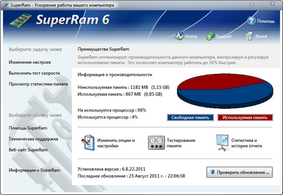 SuperRam - это инструмент для оптимизации и управления компьютерной памятью. Работать с программой просто - с ней справится даже человек, никогда раньше не работавший с подобными утилитами. Вам будет достаточно выбрать объем памяти, который будет использоваться, и объем, который следует освободить, после чего нажать кнопку "ОК". Остальное сделает SuperRam. Эффект, как уверяют создатели программы, будет заметен моментально - выразится это, конечно же, в первую очередь, в быстродействии программ, которые до этого могли отчаянно "тормозить". Кроме этого, программа всегда покажет вам график, на котором ясно видно, какой объем памяти используется, а какой - свободен.