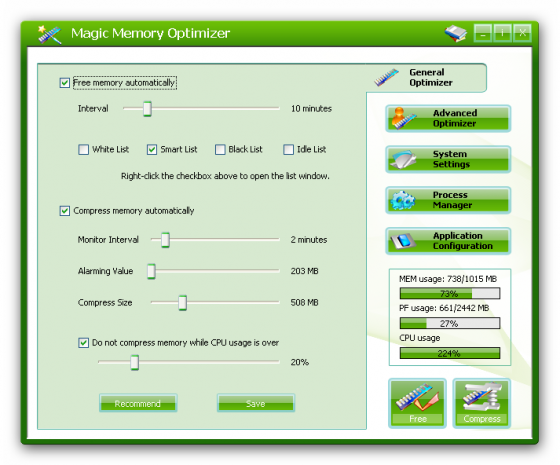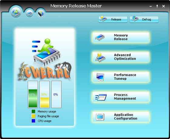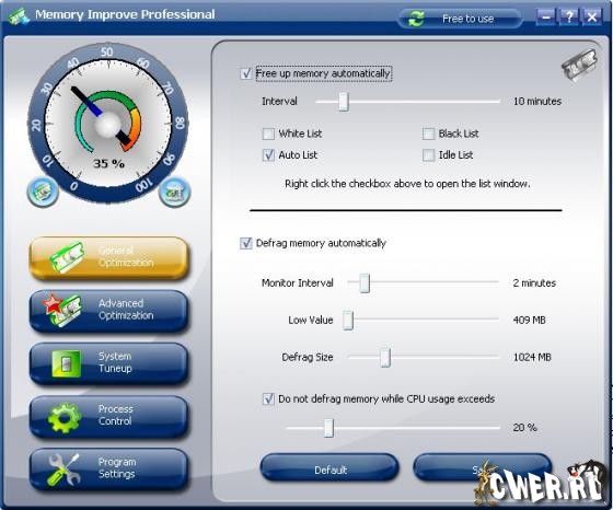 Memory Improve Master - позволяет увеличить быстродействие вашего компьютера за счет освобождения (дефрагментации) оперативной памяти. Имеется возможность установки минимального количества свободной оперативной памяти, при превышении которого запустится модуль и попытается удалить из оперативной памяти лишние процессы. Кроме этого, есть возможность просмотра запущенных процессов, наблюдение за нагрузкой на ЦП и множество других полезных настроек.