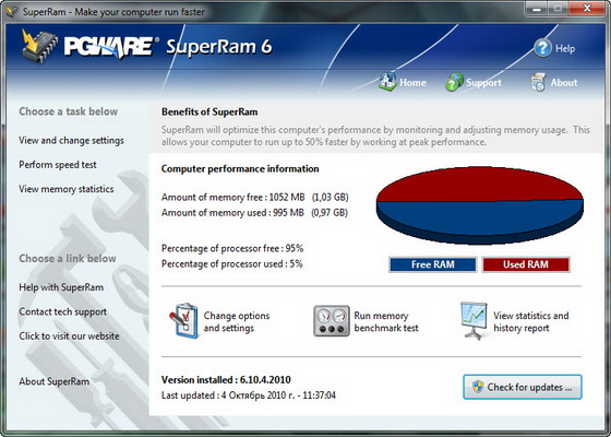 SuperRam - инструмент для оптимизации и управления компьютерной памятью. Работать с программой просто - с ней справится даже человек, никогда раньше не работавший с подобными утилитами. Вам будет достаточно выбрать объем памяти, который будет использоваться, и объем, который следует освободить, после чего нажать кнопку "ОК". Остальное сделает программа.