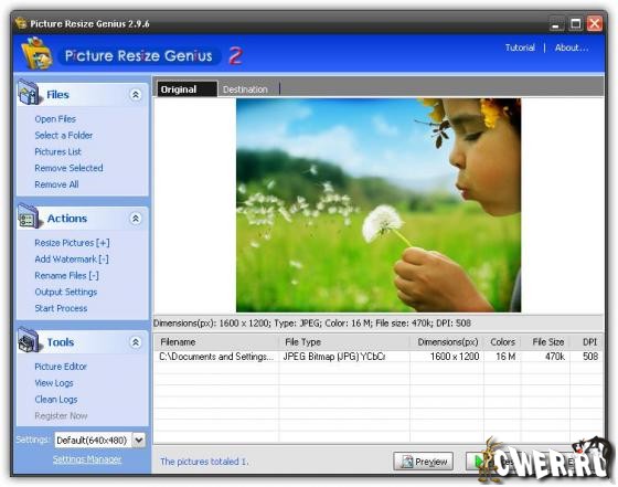 Picture Resize Genius даёт возможность изменять размер целой группе рисунков, фотографий и изображений. Кроме этого можно наносить текст поверх изображения, переименовывать файл и многое другое. Вы сможете производить все эти действия над сотнями файлов одновременно, в течение нескольких секунд.