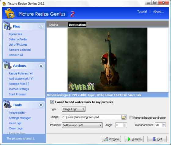Picture Resize Genius дает возможность изменять размер целой группе рисунков, фотографий и изображений. Кроме этого можно наносить водяные знаки или логотип поверх изображения, переименовывать файл и многое другое. Вы сможете производить все эти действия над сотнями файлов одновременно, в течение нескольких секунд.