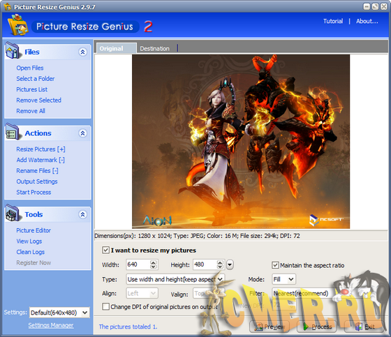 До версии 2.9.2 обновилась программа Picture Resize Genius. Picture Resize Genius дает возможность изменять размер целой группе рисунков, фотографий и изображений. Кроме этого можно наносить водяные знаки или логотип поверх изображения, переименовывать файл и многое другое. Вы сможете производить все эти действия над сотнями файлов одновременно, в течение нескольких секунд.