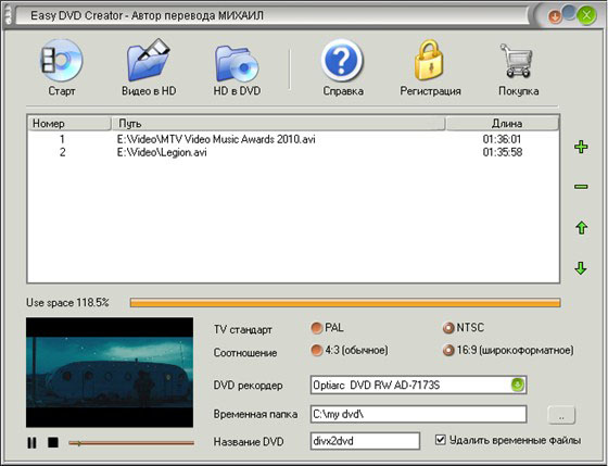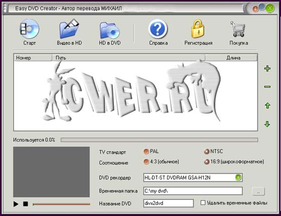 Easy DVD Creator - простой и удобный инструмент для конвертирования AVI/DIVX/XVID/DIV, MPEG/MPG/DAT, WMV/ASF/ASX, RM/RMVB, MOV/QT, 3GP/3G2, MP4/M4V, и FLV в DVD, которые вы сможете посмотреть на обычном домашнем DVD-плеере. С помощью Easy DVD Creator вы сможете превратить фильмы о ваших путешествиях, свадьбах, домашних торжествах в DVD, которые можно показать друзьям и семье! Просто добавьте видео-файлы в список файлов конвертера и нажмите кнопку “Start”