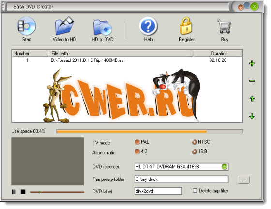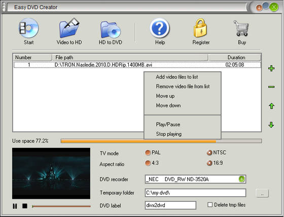 Easy DVD Creator - простой и удобный инструмент для конвертирования AVI/DIVX/XVID/DIV, MPEG/MPG/DAT, WMV/ASF/ASX, RM/RMVB, MOV/QT, 3GP/3G2, MP4/M4V, и FLV в DVD, которые вы сможете посмотреть на обычном домашнем DVD-плейере. С помощью Easy DVD Creator вы сможете превратить фильмы о ваших путешествиях, свадьбах, домашних торжествах в DVD, которые можно показать друзьям и семье! Просто добавьте видео-файлы в список файлов конвертера и нажмите кнопку “Start”.