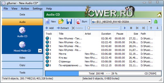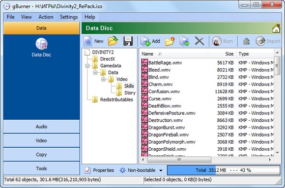 gBurner - это мощная, но легкая в использовании программа, которая позволяет создавать и прожигать data/audio, bootable и multisession CD и DVD-диски. Программа позволяет также открывать, создавать, извлекать, редактировать, конвертировать и прожигать ISO/BIN-образы.