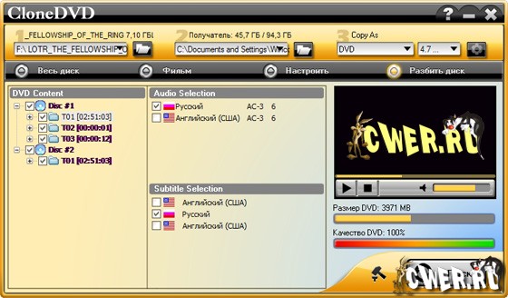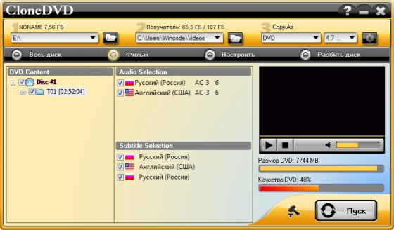 CloneDVD - гибкая и легкая в использовании программа для копирования DVD фильмов. Без настроек каких-либо особенных параметров, программа во время копирования автоматически удаляет все защиты, включая CSS, RC, RCE, UOPs и Sony ARccOS, что позволяет вам копировать всю вашу коллекцию фильмов. Программа свободно конвертирует DVD видео в один из выбранных вами форматов, после чего вы сможете просматривать ваши фильмы на Apple iPod Video, iPhone, Sony PSP, Zune, Zen, Smart Phone, PMP и других портативных устройствах.