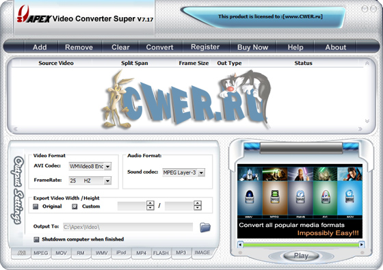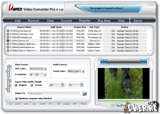Apex Video Converter Pro - мощный видеоконвертор, позволяющий легко конвертировать видеофайлы из одного формата в другой. Способен конвертировать практически все известные видеоформаты, такие как AVI, DivX, XviD, WMV, ASF, MOV, QuickTime, RM, RMVB, VCD, DVD в MPEG, VCD, DVD, RM, RMVB, WMV, ASF, AVI, DivX, XviD, MOV, QuickTime, Ipod, PSP, Flash SWF, Flash FLV, MP3, WMA. Позволяет конвертировать на высокой скорости без потерь качества, а простой в использовании интерфейс поможет легко конвертировать видеофайлы с функцией предварительного просмотра. Поддерживает видеофайлы большего размера, а также функцию пакетного преобразования.