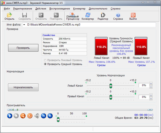 Sound Normalizer - звуковой нормализатор звука, предназначенный для повышения или восстановления уровня громкости музыкальных WAV и MP3 файлов, причем отдельно по каждому каналу. Уровень громкости отображается в графическом виде с использованием процентного значения. WAV-нормализация выполняются по пиковому уровню(пиковая нормализация), а MP3-нормализация по стандарту Replay Gain. Алгоритм Replay Gain работает, используя психоакустический анализ обрабатываемого файла для определения воспринимаемого человеком уровня громкости. Replay Gain основан на среднеквадратическом анализе Root Mean Square(RMS) и сама MP3-нормализация производится по среднему уровню громкости(RMS нормализация). Эта программа проста в использовании и даёт быстрые и превосходные результаты качественного звука. Имеется возможность пакетной обработки.