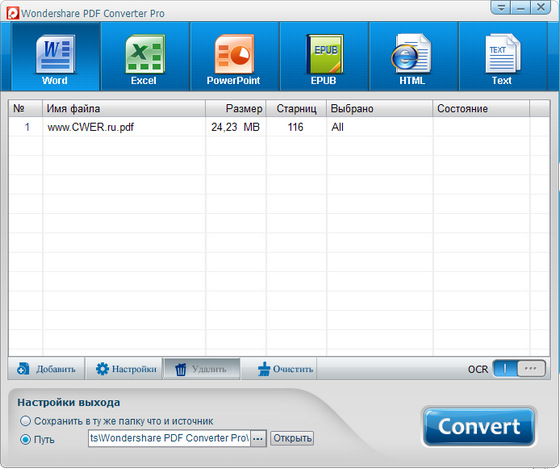 Wondershare PDF Converter Pro включает в себя все особенности обычного PDF конвертора, а также поддерживает технологию OCR, которая может конвертировать как нормальные, так и отсканированные PDF в редактируемый, текстовый формат документа. Поддерживает форматы Microsoft Word, Microsoft Excel, Microsoft PowerPoint, HTML, EPUB и текстовые документы.