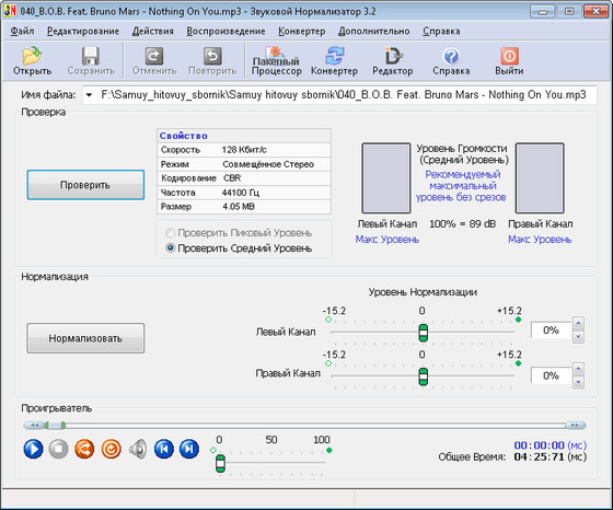 Sound Normalizer - звуковой нормализатор звука, предназначенный для повышения или восстановления уровня громкости музыкальных WAV и MP3 файлов, причем отдельно по каждому каналу. Уровень громкости отображается в графическом виде с использованием процентного значения. WAV-нормализация выполняются по пиковому уровню(пиковая нормализация), а MP3-нормализация по стандарту Replay Gain. Алгоритм Replay Gain работает, используя психоакустический анализ обрабатываемого файла для определения воспринимаемого человеком уровня громкости. Replay Gain основан на среднеквадратическом анализе Root Mean Square(RMS) и сама MP3-нормализация производится по среднему уровню громкости(RMS нормализация). Эта программа проста в использовании и даёт быстрые и превосходные результаты качественного звука. Имеется возможность пакетной обработки.
