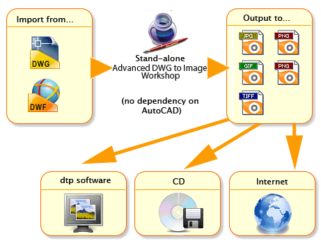 Advanced DWG to Image Workshop - программа для пакетного конвертирования DWG и DXF файлов в форматы TIF, JPG, BMP, GIF и PNG без необходимости использования AutoCAD. Позволяет вам конвертировать ваши чертежи в графические файлы без надобности в покупке дорогостоящих программных продуктов. Благодаря данной программе вам больше не нужно использование дорогостоящего ПО типа AutoCAD для разблокировки ваших DWG чертежей. Программа создает высококачественные изображения из ваших CAD чертежей. Для конвертации CAD файлов вам нужно всего-лишь добавить нужные файлы в список программы и запустить процесс преобразования одним нажатием кнопки. Программа поддерживает все версии DWG и DXF формата, включая 2007 и 2008 версии. Обладает простым и легким в использовании пользовательским интерфейсом.