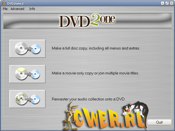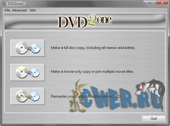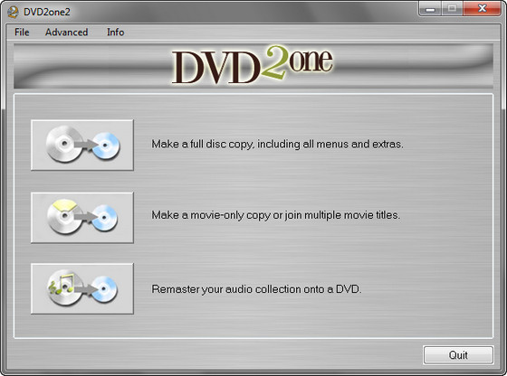 DVD2One - это мощная программа, предназначенная для создания точных копий информации (в особенности фильмов) с любого DVD-диска. DVD2One обладает высоким быстродействием (процесс полного копирования занимает от 15 до 30 минут), отличным выходным качеством изображения и уникальными возможностями, облегчающими процесс создания копий.