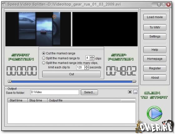 Speed Video Splitter - нарезка на фрагменты больших видео файлов. Поддержка AVI (Divx, xDiv), MPEG-4, mpeg (vcd, svcd, dvd compatible), wmv, asf, Quick Time, VOB, DAT видео форматов, сохранение фрагментов в любом поддерживаемом формате, простой и удобный интерфейс, высокая скорость и высокое качество нарезки.