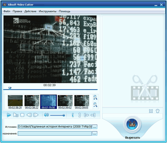 Xilisoft Video Cutter - программа позволяющая вырезать ваши любимые части из видеофайлов, сохраняя их в отдельные ролики, или просто вырезать те участки видео, которые вам не нравятся. Программа поддерживает работу с большинством популярных видеоформатов, таких как VCD, AVI, MPEG, MP4, WMV, 3GP, H.264/MPEG-4 AVC, H.264/PSP AVC, MOV, ASF и т.д. Позволяет точно выбирать начало и конец вырезаемого отрезка, поддерживает низкий приоритет конвертирования, работая в фоновом режиме и не мешая другим приложениям.