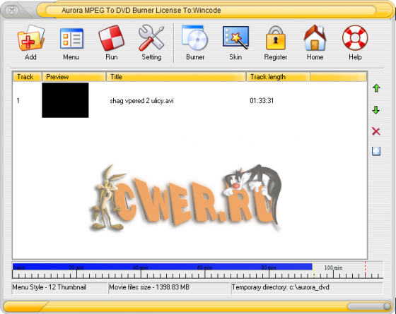 Aurora MPEG To DVD Burner - программа предназначена для записи MPEG файлов на DVD-R, DVD+R, DVD+RW, DVD-RW, VCD-R диски, для последующего просмотра на DVD-плеере. Кроме того, программа позволяет создавать структуру DVD диска, меню, с выбором всех настроек (меню, цвет, фон, шрифт и т.д.), копировать DVD или его структуру в ISO образ.