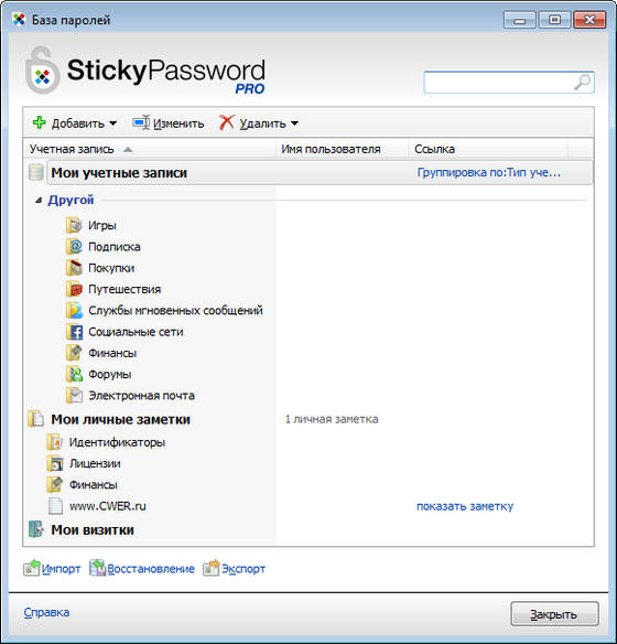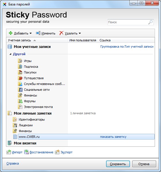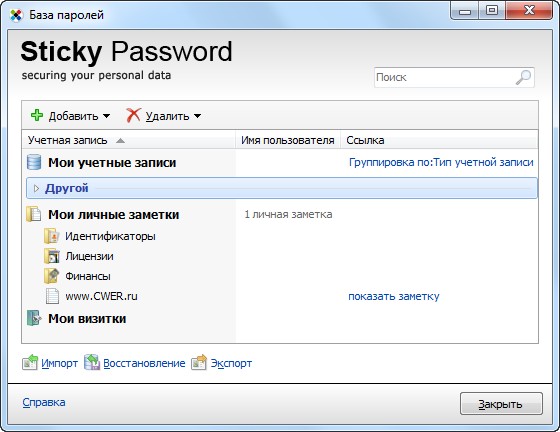 Sticky Password – уникальная программа, которая интегрируется в систему, запоминает и автоматически вводит логины и пароли в поля любого сайта, любой программы на вашем компьютере! Sticky Password противостоит кейлогерам и другим шпионским программам в попытках их захвата ваших паролей. База паролей защищена мощными алгоритмами шифрования, включая AES / Rijndael 256 имеющим на сегодняшний день самую большую надежность.