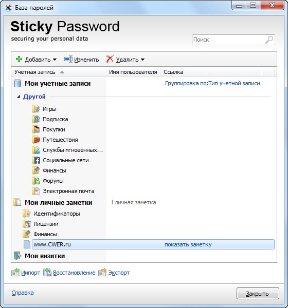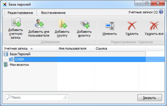 Удобная в использовании программа для хранения паролей. Все записанные в базу программы пароли, хранятся в зашифрованном виде. Базу можно организовать за различными критериями учётных записей для удобства использования. Имеется функция автозаполнения, расширенный поиск, экспорт паролей в отдельный файл, встроенный генератор паролей. Всю базу можно также распечатать в бумажно варианте, для резервного хранения. Поддерживается работа со сменными носителями.