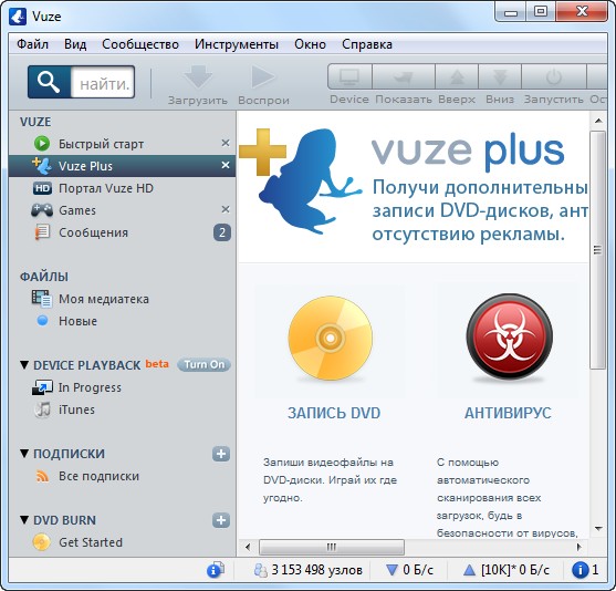 Vuze - это популярная программа для работы в Peer 2 Peer сети BitTorrent со значительно более богатым ассортиментом функций, чем фирменный клиент сети. По большому счету все богатство функционала заключается в более продвинутом подходе к управлению закачками, чему способствует симпатичный и удобный интерфейс. Немаловажным достоинством является наличие функций трекера — возможность поиска torrent файлов. Стоит упомянуть поддержку плагинов, кои можно скачать с сайта разработчика.