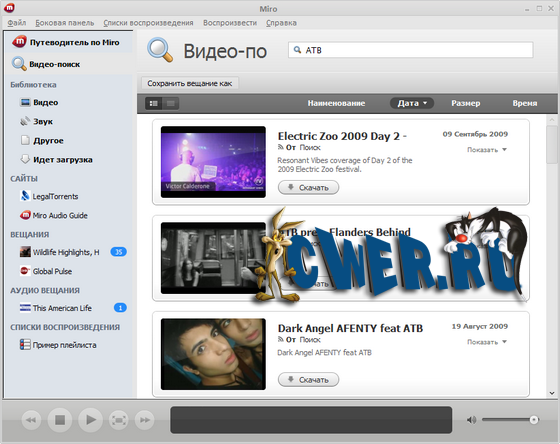 Miro - HD-видео проигрыватель, который может воспроизводить почти любой видео файл и предлагает более 6000 бесплатных передач Интернет ТВ и видео подкастов. Множество видеороликов разбиты по тематикам и объединены в плейлисты. Таким образом, Miro представляет из себя интерфейс для первого Web 2.0 телевидения! Среди сотен телеканалов найдутся и спортивные, и новостные, и развлекательные каналы. Не обошлось и без эротики. Но самое главное - имеется великолепная подборка HD-телеканалов! В сети такое предлагает сегодня разве что Joost, и то в меньшем объёме.
