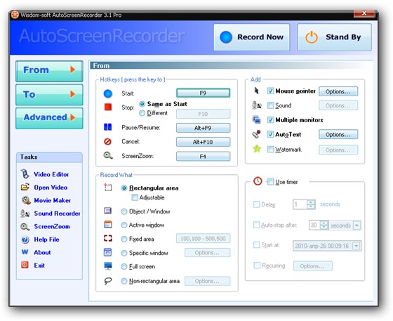 AutoScreenRecorder Pro - это легкая и мощная программа для видео записи всего, что происходит на экране вашего компьютера. Поддерживается запись звука. Программа работает с самыми популярными форматами видео (AVI, MPG, WMV и др.); возможна работа с несколькими мониторами одновременно. Игроков порадует функция онлайн записи игр без потери качества. AutoScreenRecorder обладает простым интерфейсом и поддерживает многократное увеличение экрана.
