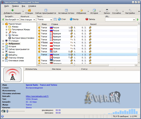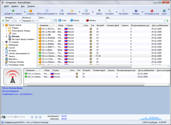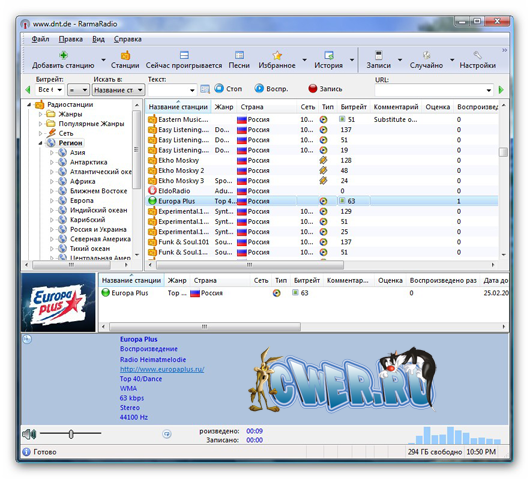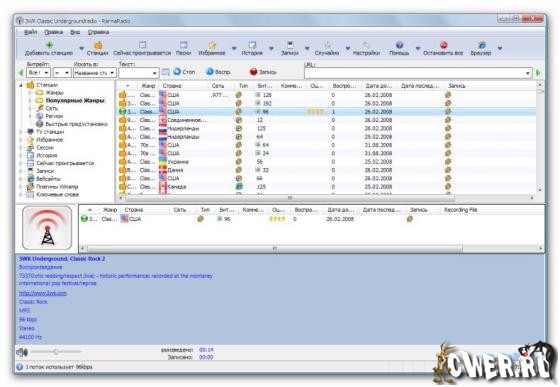 RarmaRadio - программа для прослушивания и записи интернет-радиостанций. Обладает большим набором возможностей, обеспечивая комфортное прослушивание радиостанций и удобную запись транслируемых данных. Программа содержит множество станций рассортированных на группы в зависимости от жанра музыки, битрейта, сети и региона, имеет функцию поиска станций, автоматически скачивает из Интернета информацию о проигрываемых песнях, включая альбомную графику, и поддерживает подключение плагинов медиаплеера Winamp. С помощью RarmaRadio можно слушая одну станцию, одновременно записывать несколько других интернет-радиостанций, осуществлять запись интернет-вещания по расписанию, а также автоматически начинать запись, в случае если заиграла определенная композиция. При сохранении полученных аудио файлов RarmaRadio добавляет в них теги.
