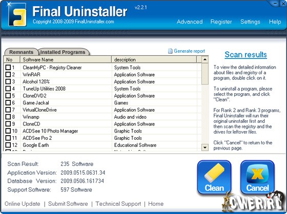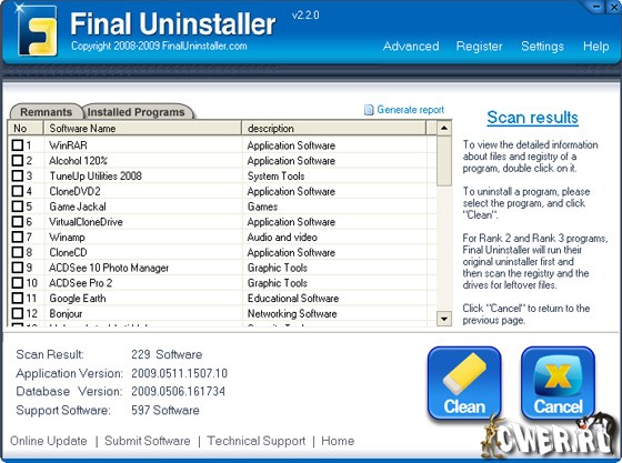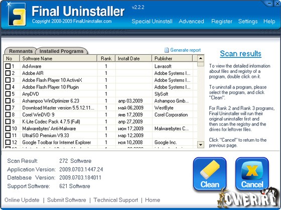 Final Uninstaller - программа позволяет очищать жесткий диск и системный реестр от мусора, оставшегося после удаления каких-либо программ. Программа использует высокоэффективный алгоритм обнаружения, который позволяет быстро просканировать систему и найти ненужные файлы и записи в системном реестре для каждой установленной программы на вашем компьютере. За несколько щелчков мыши программа просканирует ваш жесткий диск и реестр Windows, после чего предоставит вам список приложений, которые были неправильно деинсталлированы. После чего вы сможете выбрать приложения для последующего их полного удаления с компьютера. Программа имеет понятный пользовательский интерфейс и проста в использовании, поэтому подходит для любого пользователя.
