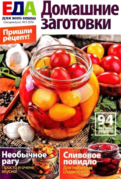 Спецвыпуски журнала «Еда» – это не только красочное издание, ценная кулинарная информация, но еще и приятное, увлекательное чтение, где за каждым рецептом – невыдуманная история его создания, реальный автор. В этом номере вы найдёте более 100 лучших рецептов домашних заготовок, среди которых варенья и джемы, соки и компоты, соленья и маринады - воспользуйтесь этими проверенными годами и опытом рецептами и консервы получатся вкусными, качественными и полезными!
