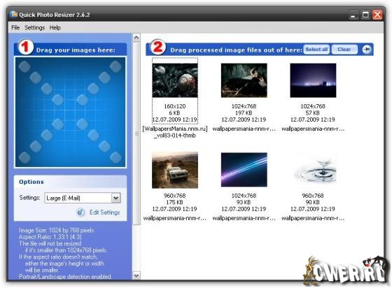 Quick Photo Resizer - легкая в использовании утилита для быстрого и удобного изменения размеров изображений перед выкладыванием их где-либо, например, в интернете. Программа позволяет выбирать схемы изменения размера изображений, перетаскивать необходимые фотографии в окно программы, после чего вы быстро сможете увидеть результат. В программе имеется возможность сохранения нескольких схем, после чего вы сможете просто выбирать их для изменения размеров очередной партии изображений. Программа может автоматически выбирать качество и уровень сжатия JPEG изображения, в зависимости от размера, который вы указали в настройках. Кроме того, в программе имеется возможность добавления собственных графических водяных знаков, например, с логотипом вашей компании или сайта. Программа легка в использовании и обладает простым пользовательским интерфейсом.
