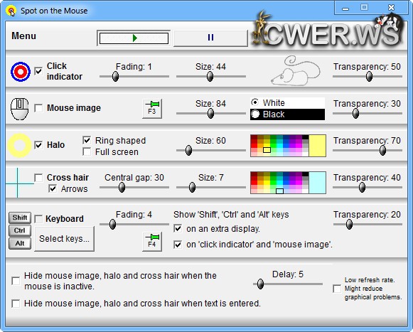 Программа-вузуализатор, превращающая обычную мышку в интерактивную указку. Исключительное решение для процесса обучения и проведения презентаций. Позволяет более продуктивно акцентировать внимание и усвоение предлагаемого материала различными креативно меняющимися указателями, которые имеют множество настроек: нарастающие круги, луч фонарика и перекрестия прицела, цвета, прозрачность и секундное “подвисание” на покинутых объектах для наглядного отображения пути следования по элементам экрана. Управление осуществляется и назначается сразу трем кнопкам манипулятора.