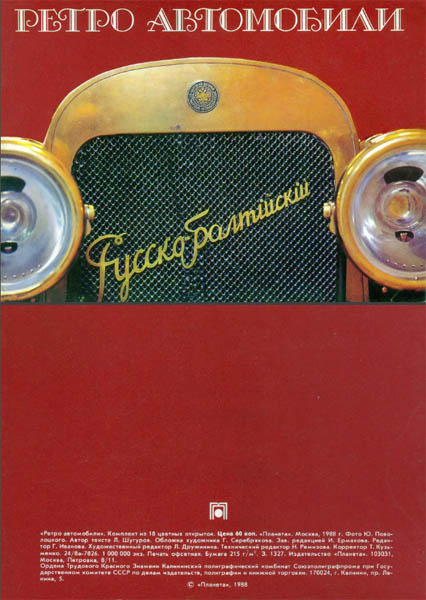 Набор из 18 открыток. На обратной стороне каждой открытки описание модели и краткая история. Автомобили 1898 - 1932 годов - самые редкие. Среди них есть отечественные, правда, они не все сохранились, но из десятка известных в настоящее время экземпляров в комплекте представлены три наиболее интересные: «Руссо-Балт-К12/20», АМО-Ф15, НАМИ-1.