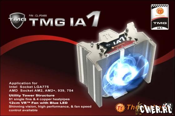 В ассортименте выпускаемых компанией Thermaltake Technology процессорных кулеров появилась новая универсальная модель Thermaltake TMG IA1, совместимая с разъёмами Socket LGA775 (Intel) и Socket AM2 (AMD).