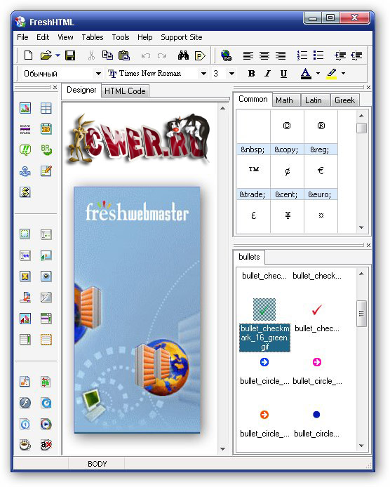 HTML-редактор с огромным количеством различных функций (подсказки, справочники, многоцветная подсветка синтаксиса, предпросмотр с разным разрешением, позволяющий подключить до четырех браузеров, поддержка скриптов и сами скрипты, которые входят в поставку - 15 DHTML, 17 Perl, 6 HTML, 2 CGI и 450 Javascripts/VBScripts и т. д.). Предусмотрена полезная возможность запуска редактора в разных режимах, в зависимости от подготовки пользователя. Работает в том числе и с русским языком. Настройка: в меню Options/Editing Preferences нужно выбрать подходящий шрифт, а также установить charset - Russian.