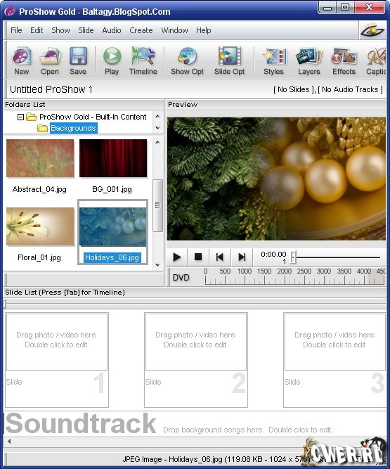 С одной стороны, ProShow Gold - программа очень простая в применении (поддерживается drag-and-drop), с другой - обладает множеством полезных возможностей, начиная с автоматической синхронизации времени проигрывания музыкального сопровождения со временем показа слайд-шоу до очень удобной записи созданного проекта на DVD и VCD.