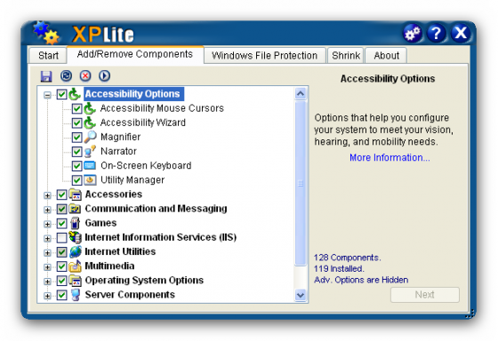 XPlite — это очень мощная программа, предназначенная для удаления множества ненужных компонентов из Windows XP и Windows 2000. XPLite позволяет удалить компоненты операционной системы, которые обычными средствами удалить невозможно. В первую очередь можно отметить удаление совершенно ненужных рисунков, заставок, указателей мыши, обоев рабочего стола и прочей чепухи. Без проблем можно полностью удалить из системы встроенный Outlook Express, адресную книгу, Windows Messenger а также всяческие чаты и NetMeeting'и. Чтобы удалить ненужный компонент достаточно снять с него галочку и нажать кнопочку Next. Программа создаст контрольную точку восстановления и удалит всё, что вы ей скажете. Так же легко можно впоследствии заново установить удалённый компонент.