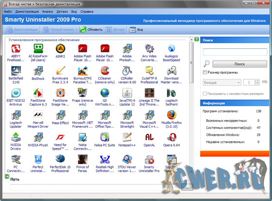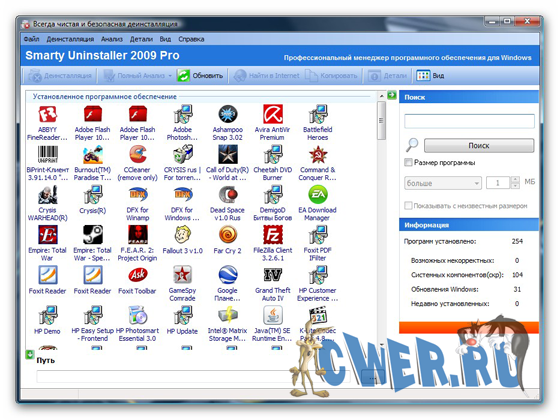 Smarty Uninstaller 2009 - Обеспечивает решение задач по деинсталляции приложений, установленных на вашем компьютере. Он служит заменой стандартному диалогу Добавить/Удалить программу Windows . При этом работает приблизительно в 5-10 раз быстрее. Может показывать соответствующие значки приложений. Имеется функция поиска приложения по ключевому слову.