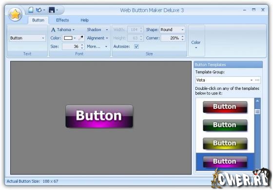 Web Button Maker Deluxe - программа для создания анимированных кнопок для Вашего вебсайта. Создавайте кнопки в стиле Windows Vista и Windows XP, Mac и Aqua, красочные, сияющие и анимированные кнопки для Web, а так же многое другое, используя Web Button Maker Deluxe. Выберите кнопку из более чем 100 заготовок и добавьте эффекты, такие как сияние, обводка, пульсация, прозрачность, градиентный цвет, стиль шрифта, тень и другое. Вы можете сохранить свои кнопки как BMP, GIF, JPEG, PNG, TIFF, EXIF, WMF, EMF, ICON, а так же анимированные GIF и TIFF файлы.