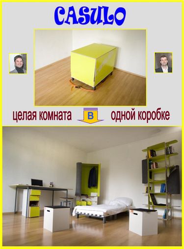 Casulo - полный комплект мебели для комнаты, которая может быть собрана меньше, чем за десять минут. Для ее установки не требуется никаких дополнительных материалов и инструментов, она просто раскладывается из основы. Casulo включает в себя платяной шкаф, стол с шестью ящичками, регулируемый по высоте стул, два пуфа, в которых также можно хранить небольшие предметы, этажерка с шестью полками для книг, и, конечно же, кровать с матрасом.