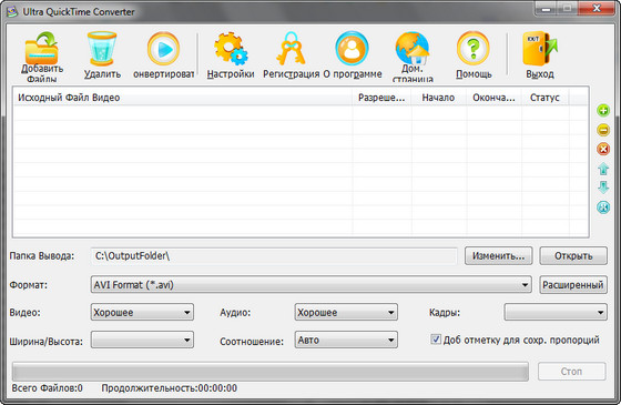 С быстрым и мощным кодировщиком видео QuickTime, программа Ultra QuickTime Converter поддерживает почти все файлы MOV, QT, MP4, M4V, вам даже не придется устанавливать проигрыватель QuickTime. Интегрированный высокоскоростной кодировщик MPEG-2, который позволит вам DVD-видео файлы (VIDEO_TS, AUDIO_TS) и VCD/SVCD образы (*.bin,*.cue), так что вы можете записывать VCD/SVCD/DVD диск с файлов QuickTime, используя программу для записи. Это программа для конвертирования видео форматов на высокой скорости и с высоким качеством. Программа имеет дружественный мультиязычный интерфейс, включая русский язык и профили качества, то есть при помощи одного клика вы сможете профессионально конвертировать файлы.