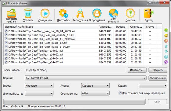 Ultra Video Joiner - это профессиональная программа для соединения неограниченного количества видео файлов в один большой. Данная программа поддерживает AVI, DivX, MPEG1, MPEG2, VOB, DAT, WMV, ASF форматы, позволяет конвертировать между этими форматами, настроить кодек, размер, битрейт, число кадров в секунду и т.д.