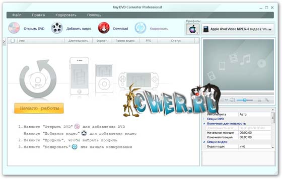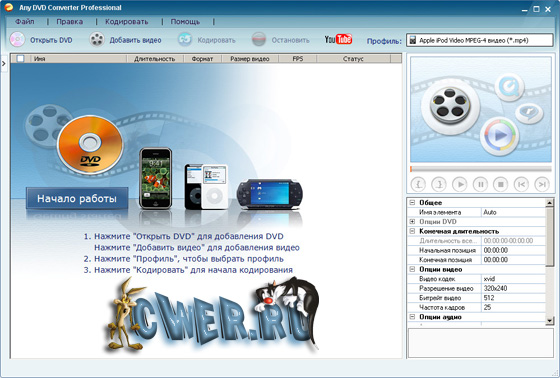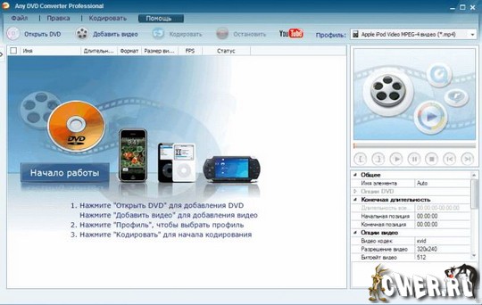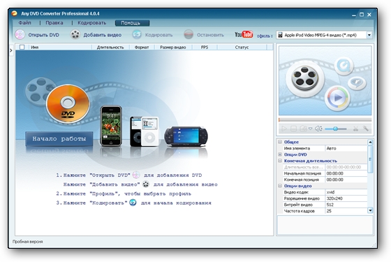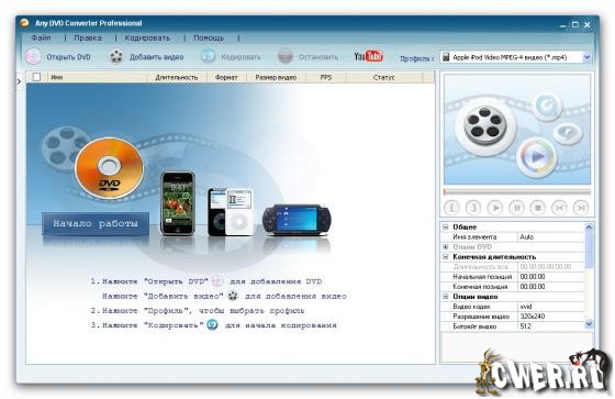 Отличный инструмент для конвертирования видео, с помощью которого можно конвертировать DVD в видео формат, поддерживаемый Apple iPod Movie и iPod Video (MP4) с быстрой скоростью конвертирования и превосходным качеством видео. Данный видео конвертер может преобразовать все типы видео файлов (avi, divx, xvid, flv, x264, vob, mpeg, DVD, YouTube, и т.д.) в надлежащие видео форматы (MPEG-4, H.264) для проигрывания на iPod.Также данным конвертером можно преобразовать видео для любого типа iPod, который проигрывает видео. Поддерживаются iPod, iPod touch, iPod nano и iPod classic в дополнение к 5-ому поколению iPod. Вы можете также преобразовать видео для iPhone.