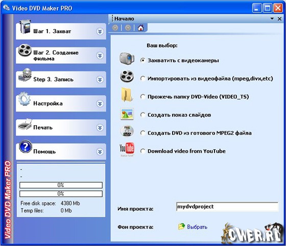 Video DVD Maker может создавать DVD на основе видеофайлов в форматах AVI, DIVX, XVID, MP4, MPG, WMV, ASF, MOV, а также выполнять захват видео с ТВ-тюнера, веб-камеры, DV-камеры и других устройств. Работа программы организована в виде пошагового мастера, и процесс создания диска разбит на три этапа: захват видео, добавление дополнительных файлов, запись DVD. Программа поддерживает запись на любые типы дисков, в том числе двухслойные DVD. Русский интерфейс присутствует.