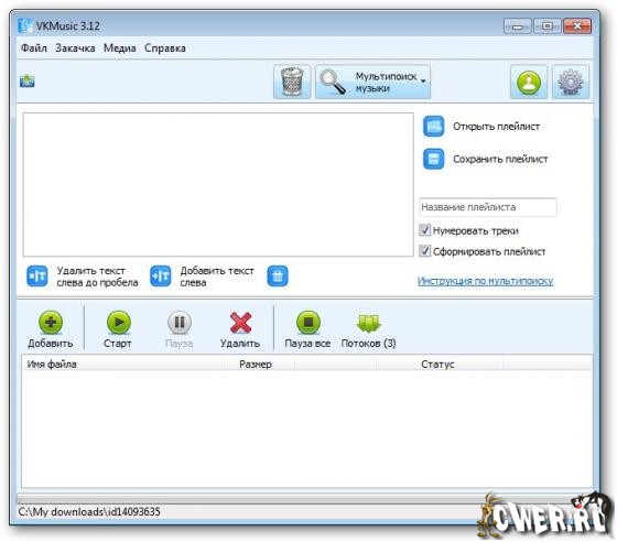 VKMusic 3.12 - поисковик и менеджер закачек аудио/видеозаписей залитых пользователями таких популярных ресурсов как социальная сеть Vkontakte.Ru, RuTube и YouTube. (Так-же поддерживает закачку видео с сайтов video.google.com, video.mail.ru, smotri.com, 1tv.ru, a1tv.ru, video.bigmir.net, games-tv.ru, corbina.tv, video.eurosport.ru, intv.ru и tnt-tv.ru).