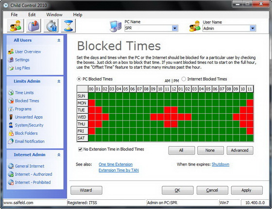 Salfeld Child Control - программа ограничивает время, проводимое вашими детьми за компьютером, как только выделенное им время закончится, компьютер автоматически выключится и повторный вход будет возможен только после ввода пароля. Ограничение можно ввести как по общему времени (например, не более 1 часа в день), так и по периоду времени, когда можно работать (например, с 22:00 до 8:00 доступ запрещен). Кроме этого, программа позволяет запретить посещение нежелательных сайтов, а также заблокировать доступ к определенным дискам и папкам.