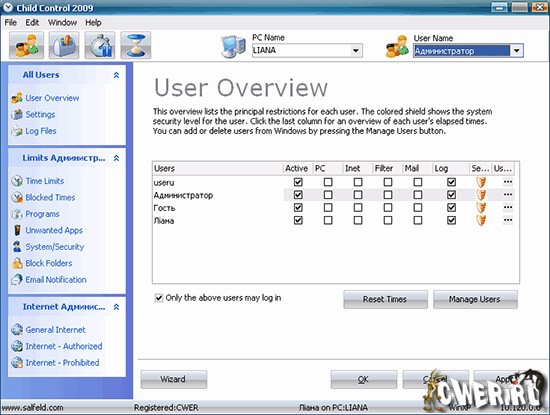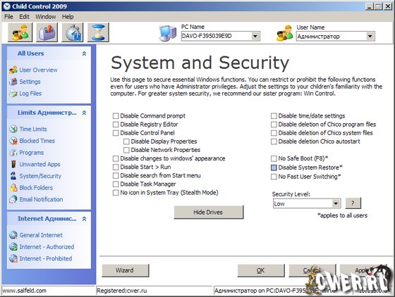 Child Control 2009 - программа предназначена для родителей, желающих, чтобы их чадо меньше времени проводило за компьютером, а также для фильтрации открываемых в браузере интернет-страниц и контента. Есть возможность установки временного ограничения на работу компьютера или защиту паролем. Настройки программы довольно гибкие и осуществляются в несколько шагов.