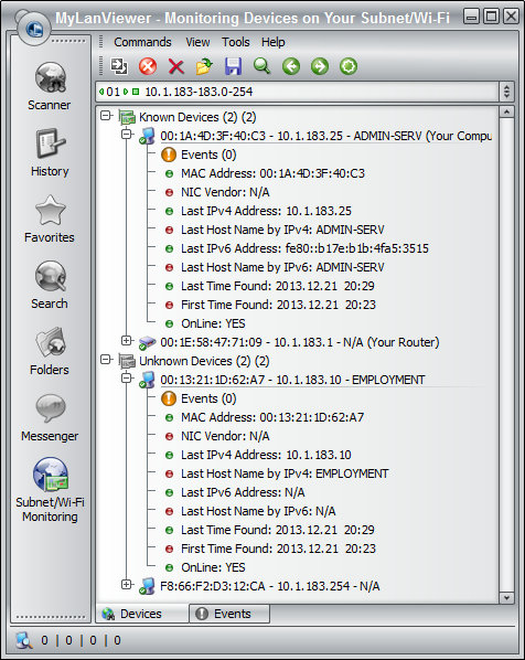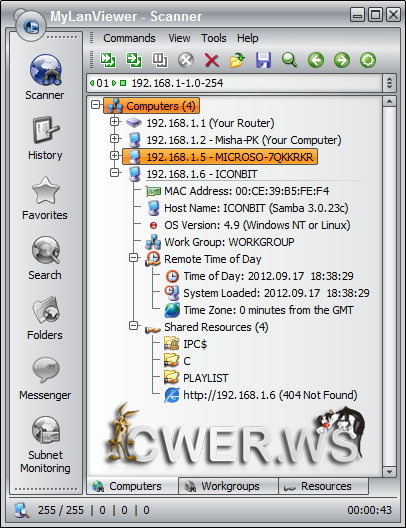 MyLanViewer — программа для сканирования и мониторинга компьютеров в сети с возможностью поиска общедоступных файлов. Она показывает компьютеры в удобном для просмотра виде, который содержит имя компьютера, IP адрес, MAC адрес, общие ресурсы и другие детали для каждого компьютера. С помощью её вы можете следить за компьютерами в сети и получать оповещение, когда состояние одного из них изменится. Также вы можете управлять своими общими ресурсами, запрещать их и закрывать к ним сессии.