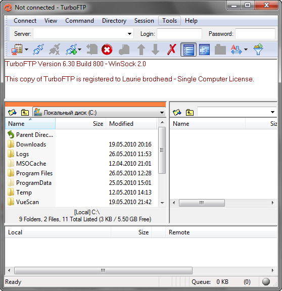 TurboFTP - защищенный FTP клиент с широкими функциональными возможностями, с помощью которого можно легко производить передачу файлов через Интернет. Программа позволяет вам передавать файлы, загружая или скачивая их, на высокой скорости между вашим компьютером и виртуальным FTP сервером с исключительной легкостью и, при необходимости, с возможностью шифрования передачи. Обладая простым и легким в использовании интерфейсом, с помощью данной программы пользователь сможет выполнять такие задачи, как загрузка веб сайта, планирование синхронизации и резервирования файлов и папок, а также критически важные корпоративные файловые передачи. Программой поддерживаются брандмауэры, в том числе HTTP прокси, SOCKS 4, SOCKS 4a и SOCKS 5, а также защищенные соединения SSL/TLS.