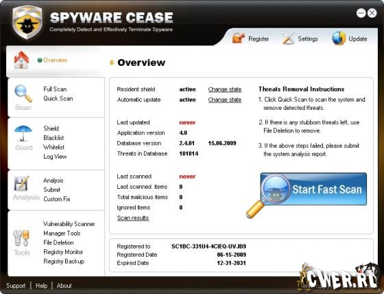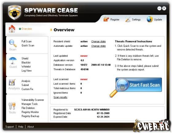 Spyware Cease - выдающаяся антишпионская программа для Windows, которая может быть использована для эффективной защиты вашего компьютера от различных вредоносных программ. Программа поможет вам защититься от троянских программ, шпионских и рекламных модулей, кейлоггеров, червей, руткитов, программ для кражи паролей и многих других вредоносных программ. Spyware Cease просканирует, удалит и заблокирует найденные вредоносные приложения. Утилита является мощным приложением для отлова и уничтожения вредоносных программ, но, при этом, программа не потребляет много системных ресурсов. С помощью этой программы вы не только сможете защитить свой компьютер от вирусов и троянских программ, но и с легкостью повысить производительность вашей системы.